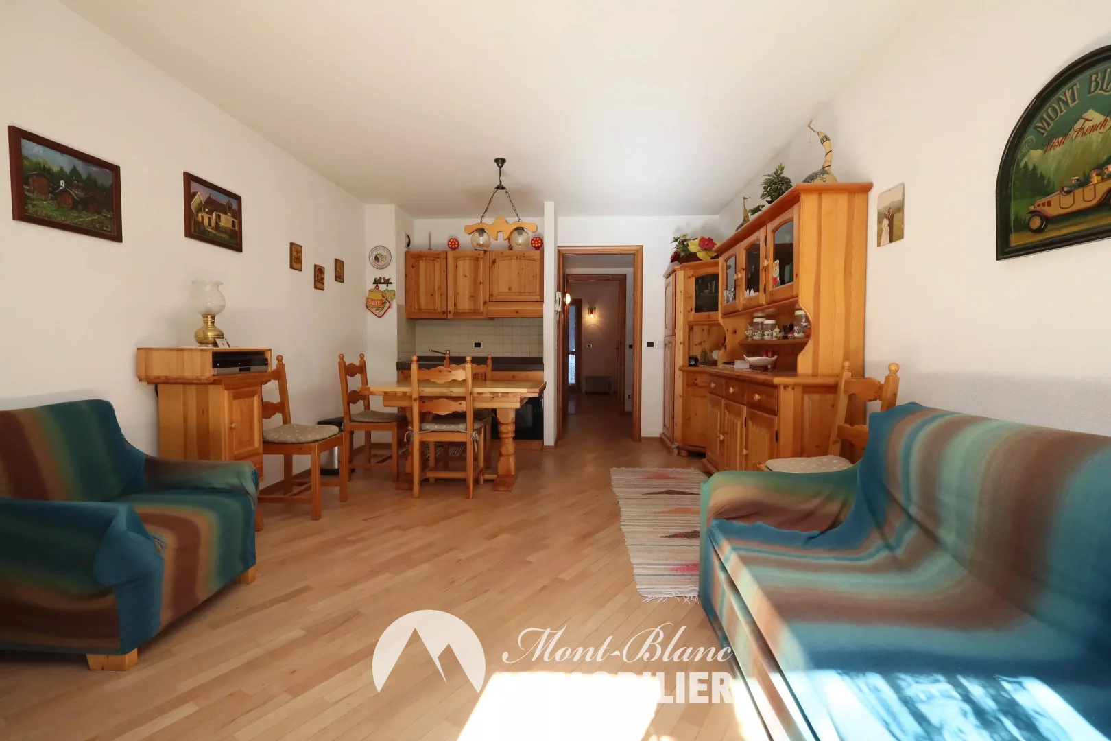 Grand deux pièces de 44 m², exposé sud-est. La pièce de vie comprend une petite cuisine ouverte , un coin repas et un espace séjour avec cheminée, la pièce s'ouvre sur une petite terrasse avec vue sur l’Aiguille du Midi.